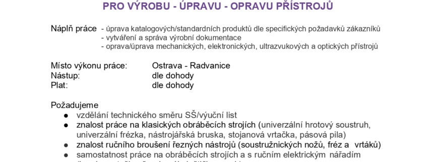 PRO VÝROBU – ÚPRAVU – OPRAVU PŘÍSTROJŮ Náplň práce – úprava katalogových/standardních produktů dle specifických požadavků zákazníků