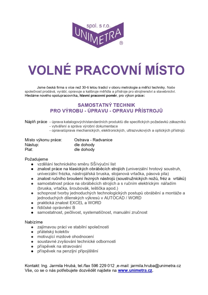 PRO VÝROBU – ÚPRAVU – OPRAVU PŘÍSTROJŮ Náplň práce – úprava katalogových/standardních produktů dle specifických požadavků zákazníků