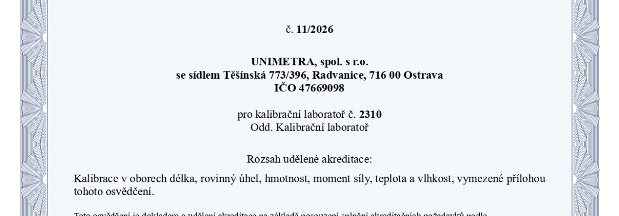 Kalibrační laboratoř společnosti Unimetra spol. s r.o. úspěšně dokončila proces reakreditace u Českého institutu pro akreditaci o.p.s. (signatář EA MLA). Reakreditace potvrzuje, že laboratoř nadále splňuje nejpřísnější mezinárodní standardy kvality a spolehlivosti v oblasti kalibrací. Laboratoř je akreditována v měřicích oborech: Délka Rovinný úhel Hmotnost Moment síly Teplota Vlhkost Tato akreditace platí do 7. ledna […]